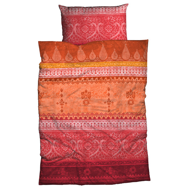 Sorgen Sie mit der Bettwäsche Indi von Casatex für eine romantische und gemütliche Atmosphäre in Ihrem Schlafzimmer. Die indischen Ornamente präsentieren sich in warmen Orange-, Rot- und Gelb-Farbtönen und fügen sich zu einer stimmigen Musterung zusammen. Kuscheln Sie sich in die glatte und anschmiegsame Satin Oberfläche aus 100 Prozent Baumwolle und genießen Sie einen komfortablen und erholsamen Schlaf.